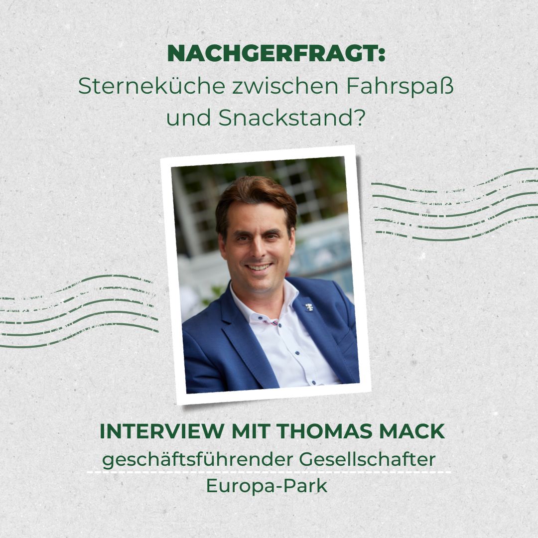 Thomas Mack, geboren 1981 in Lahr, ist geschäftsführender Gesellschafter des Europa-Park in Rust und zählt zur achten Generation der Unternehmerfamilie Mack. Nach seiner Ausbildung an der Hotelfachschule Luzern sammelte er internationale Erfahrung in Spitzenrestaurants, Hotels und Freizeitparks auf mehreren Kontinenten. 2007 stieg er in die Geschäftsleitung des Europa-Parks ein, seit 2016 gehört er zur obersten Führungsspitze. Dort verantwortet er unter anderem die Hotel- und Gastronomiesparte, das Entertainment sowie Großprojekte wie das 4-Sterne-Superior-Hotel „Bell Rock“, das mit zwei Michelin-Sternen ausgezeichnete Restaurant Ammolite – The Lighthouse, den Wasserpark Rulantica und das multisensorische Fine-Dining-Erlebnis Eatrenalin. Für seinen Innovationsgeist wurde er mehrfach ausgezeichnet, etwa als Hotelier des Jahres oder Restaurateur des Jahres. Thomas Mack steht für eine Mischung aus Familiensinn, Kreativität und unternehmerischer Vision, mit der er den Europa-Park konsequent vom Freizeitpark zum ganzjährigen Erlebnisresort weiterentwickelt.